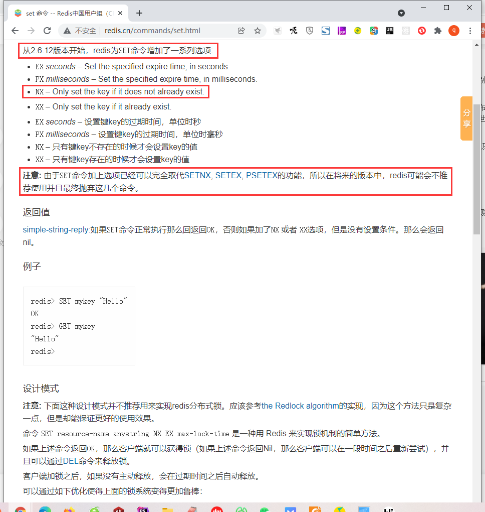 10、参考网址:http://www.redis.cn/commands/set.html 。方案三 的代码实现逻辑仍然过于复杂,相对于 方案二 而言。且为了尽量避免执行到直接加锁的流程,还实现了一个判断锁定是否存在的方法。计划后续有空余时间后,准备将 锁定实现 调整为 方案二。方案二的逻辑更为简单,可读性更好。由于SET命令加上选项已经可以完全取代SETNX, SETEX, PSETEX的功能,所以在将来的版本中,redis可能会不推荐使用并且最终抛弃这几个命令。如图1