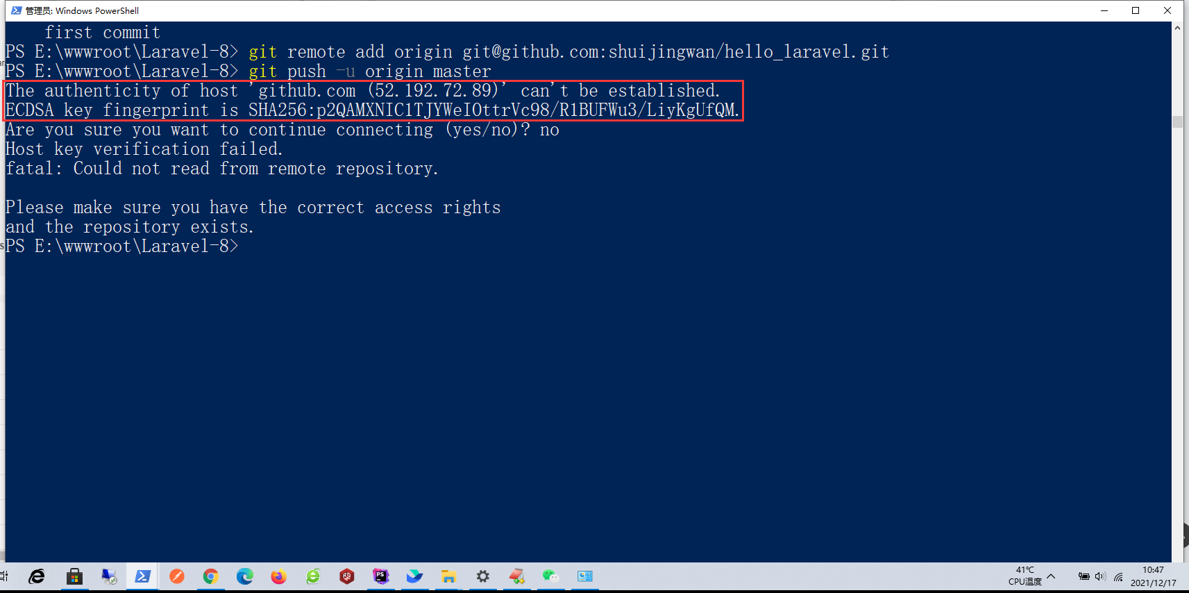 PS E:\wwwroot\Laravel-8> git remote add origin git@github.com:shuijingwan/hello_laravel.git PS E:\wwwroot\Laravel-8> git push -u origin master The authenticity of host 'github.com (52.192.72.89)' can't be established. ECDSA key fingerprint is SHA256:p2QAMXNIC1TJYWeIOttrVc98/R1BUFWu3/LiyKgUfQM. Are you sure you want to continue connecting (yes/no)? no Host key verification failed. fatal: Could not read from remote repository. Please make sure you have the correct access rights and the repository exists. PS E:\wwwroot\Laravel-8> git push -u origin master The authenticity of host 'github.com (52.69.186.44)' can't be established. ECDSA key fingerprint is SHA256:p2QAMXNIC1TJYWeIOttrVc98/R1BUFWu3/LiyKgUfQM. Are you sure you want to continue connecting (yes/no)? yes Warning: Permanently added 'github.com,52.69.186.44' (ECDSA) to the list of known hosts. git@github.com: Permission denied (publickey). fatal: Could not read from remote repository. Please make sure you have the correct access rights and the repository exists. PS E:\wwwroot\Laravel-8> git push -u origin master git@github.com: Permission denied (publickey). fatal: Could not read from remote repository. Please make sure you have the correct access rights and the repository exists.