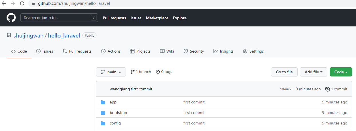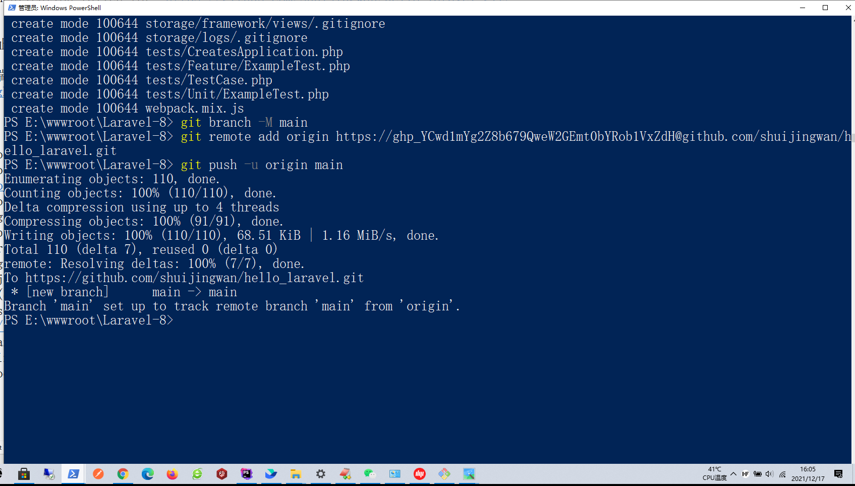 PS E:\wwwroot\Laravel-8> git branch -M main PS E:\wwwroot\Laravel-8> git remote add origin https://xxx@github.com/shuijingwan/hello_laravel.git PS E:\wwwroot\Laravel-8> git push -u origin main Enumerating objects: 110, done. Counting objects: 100% (110/110), done. Delta compression using up to 4 threads Compressing objects: 100% (91/91), done. Writing objects: 100% (110/110), 68.51 KiB | 1.16 MiB/s, done. Total 110 (delta 7), reused 0 (delta 0) remote: Resolving deltas: 100% (7/7), done. To https://github.com/shuijingwan/hello_laravel.git * [new branch] main -> main Branch 'main' set up to track remote branch 'main' from 'origin'. PS E:\wwwroot\Laravel-8>Git Bash
