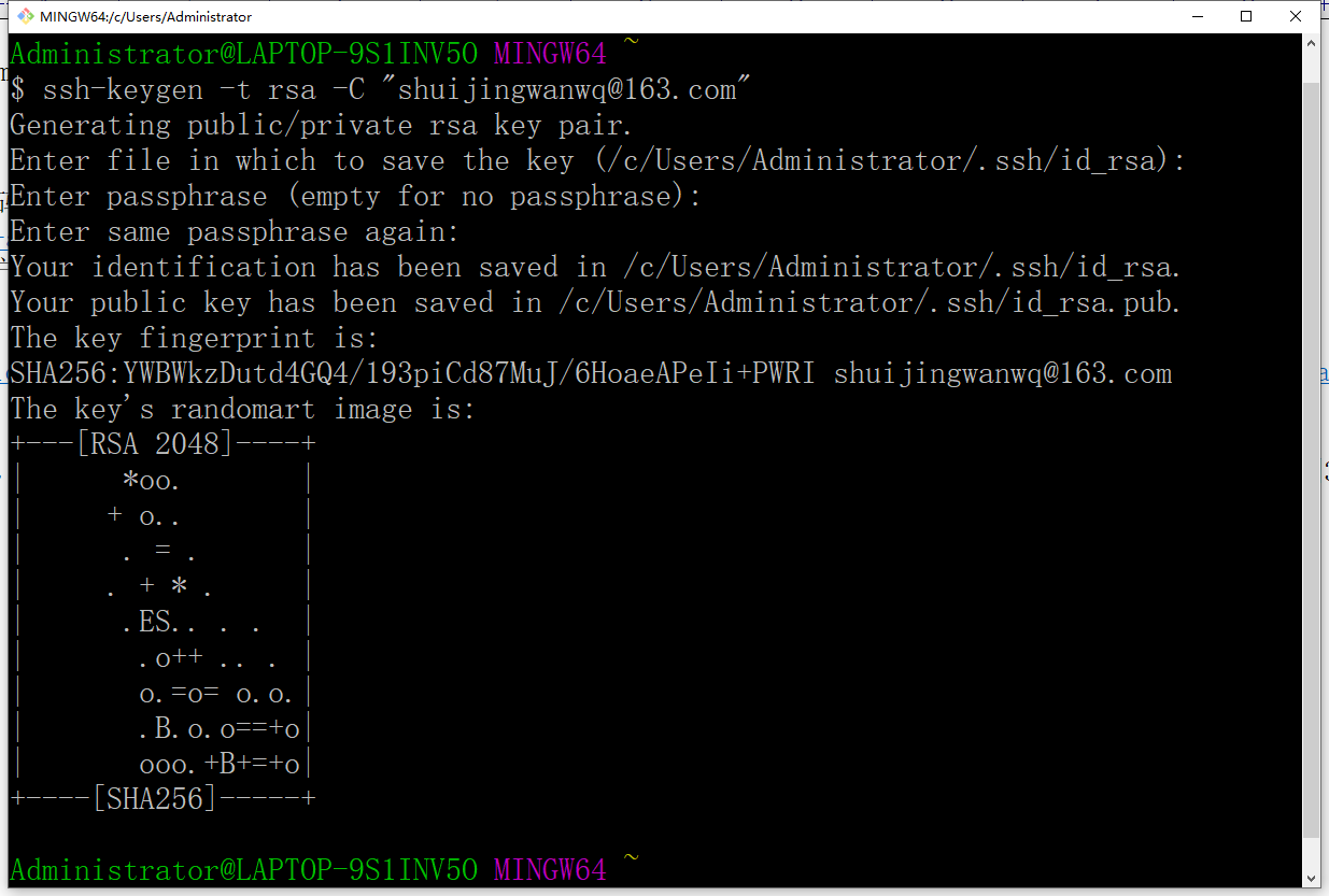 $ ssh-keygen -t rsa -C "shuijingwanwq@163.com" Generating public/private rsa key pair. Enter file in which to save the key (/c/Users/Administrator/.ssh/id_rsa): Enter passphrase (empty for no passphrase): Enter same passphrase again: Your identification has been saved in /c/Users/Administrator/.ssh/id_rsa. Your public key has been saved in /c/Users/Administrator/.ssh/id_rsa.pub. The key fingerprint is: SHA256:YWBWkzDutd4GQ4/193piCd87MuJ/6HoaeAPeIi+PWRI shuijingwanwq@163.com The key's randomart image is: +---[RSA 2048]----+ | *oo. | | + o.. | | . = . | | . + * . | | .ES.. . . | | .o++ .. . | | o.=o= o.o.| | .B.o.o==+o| | ooo.+B+=+o| +----[SHA256]-----+ Administrator@LAPTOP-9S1INV5O MINGW64 ~ $