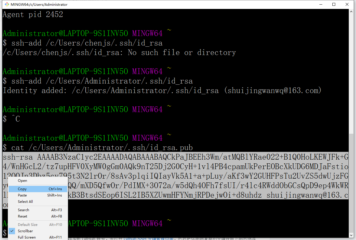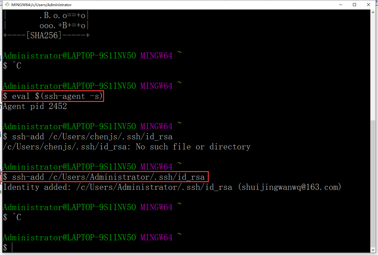 Administrator@LAPTOP-9S1INV5O MINGW64 ~ $ eval $(ssh-agent -s) Agent pid 2452 Administrator@LAPTOP-9S1INV5O MINGW64 ~ $ ssh-add /c/Users/Administrator/.ssh/id_rsa Identity added: /c/Users/Administrator/.ssh/id_rsa (shuijingwanwq@163.com)
