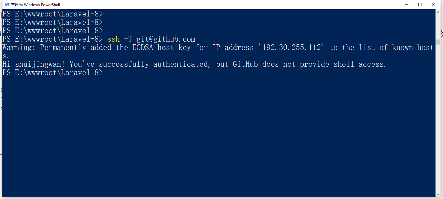 PS E:\wwwroot\Laravel-8> ssh -T git@github.com Warning: Permanently added the ECDSA host key for IP address '192.30.255.112' to the list of known hosts. Hi shuijingwan! You've successfully authenticated, but GitHub does not provide shell access.
