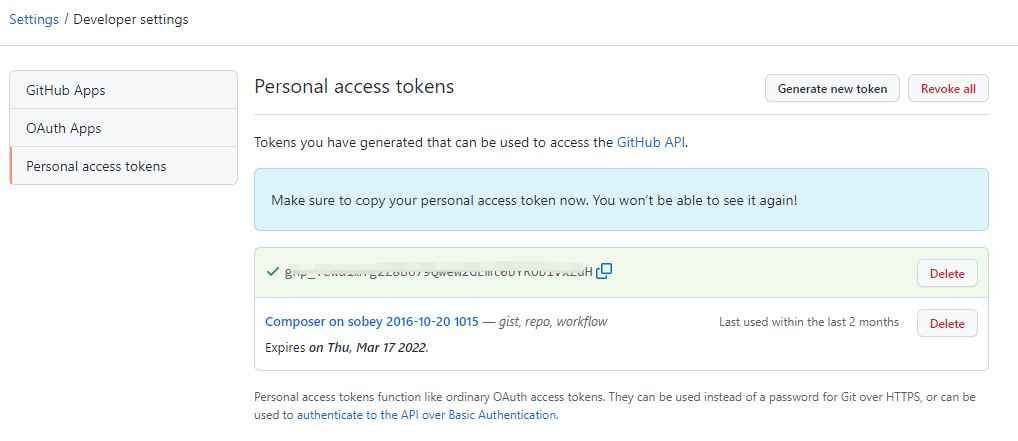 git.exe push --progress "origin" master:master Logon failed, use ctrl+c to cancel basic credential prompt. Logon failed, use ctrl+c to cancel basic credential prompt. remote: Support for password authentication was removed on August 13, 2021. Please use a personal access token instead. remote: Please see https://github.blog/2020-12-15-token-authentication-requirements-for-git-operations/ for more information. fatal: Authentication failed for 'https://github.com/shuijingwan/yii2-app-advanced.git/' git 未能顺利结束 (退出码 128) (71079 ms @ 2021/12/17 11:26:10)