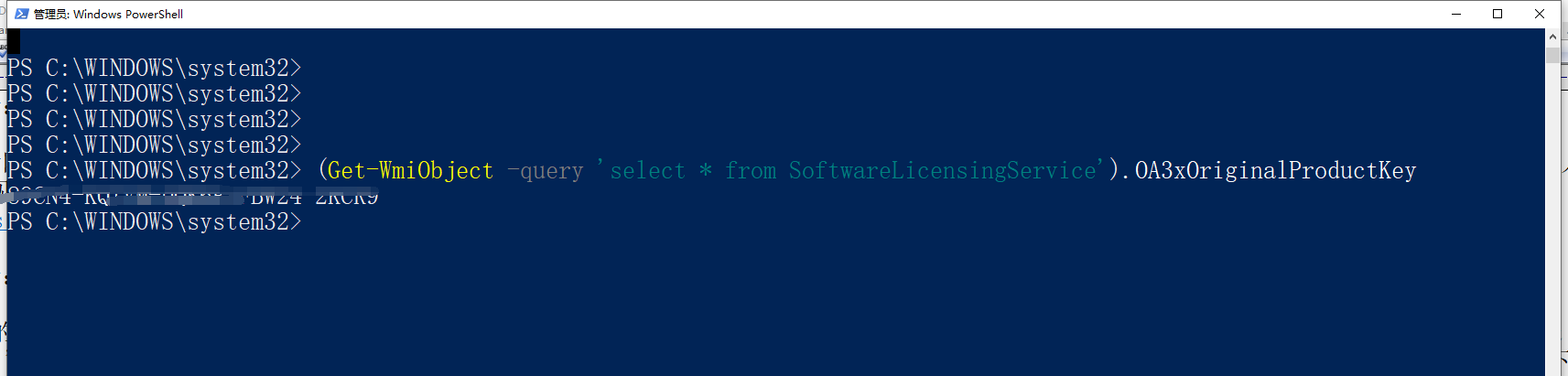 PS C:\WINDOWS\system32> (Get-WmiObject -query 'select * from SoftwareLicensingService').OA3xOriginalProductKey