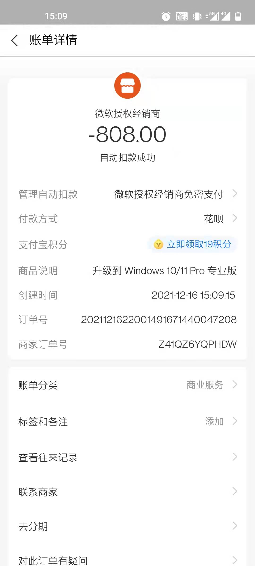 5、微软授权经销商自动扣款:808.00 成功。如图5