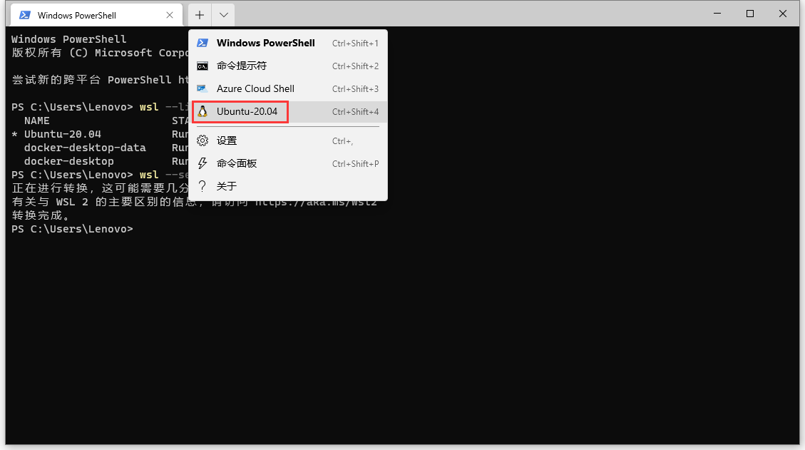1、安装 Nginx Proxy Manager ,打开 Windows Terminal 命令行,按照以下指示进入 Ubuntu 系统。如图1