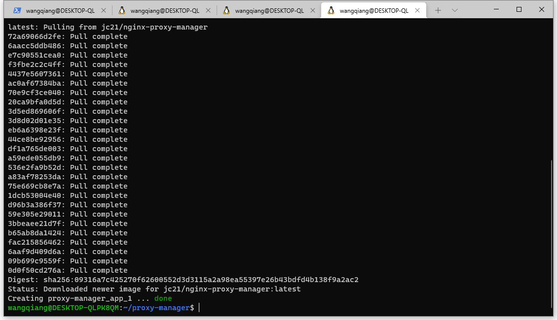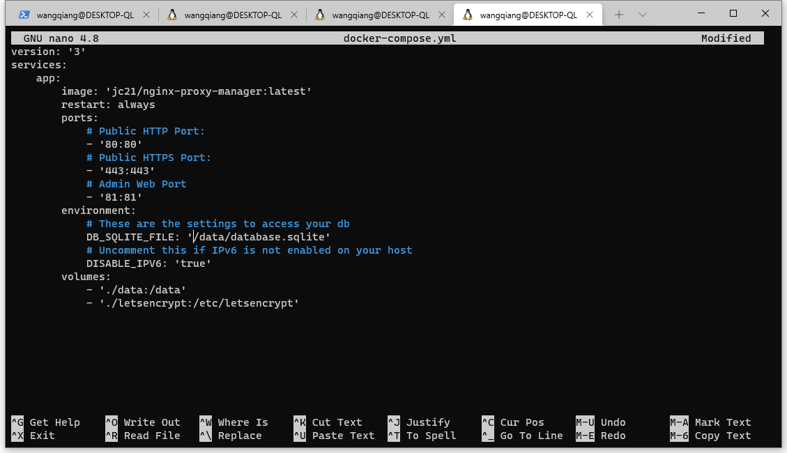 wangqiang@DESKTOP-QLPK8QM:/mnt/c/Users/Lenovo$ cd ~ wangqiang@DESKTOP-QLPK8QM:~$ mkdir proxy-manager wangqiang@DESKTOP-QLPK8QM:~$ ls proxy-manager wangqiang@DESKTOP-QLPK8QM:~$ cd proxy-manager/ wangqiang@DESKTOP-QLPK8QM:~/proxy-manager$ nano docker-compose.yml