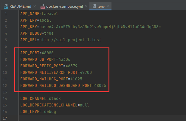 APP_PORT=48080 FORWARD_DB_PORT=43306 FORWARD_REDIS_PORT=46379 FORWARD_MEILISEARCH_PORT=47700 FORWARD_MAILHOG_PORT=41025 FORWARD_MAILHOG_DASHBOARD_PORT=48025