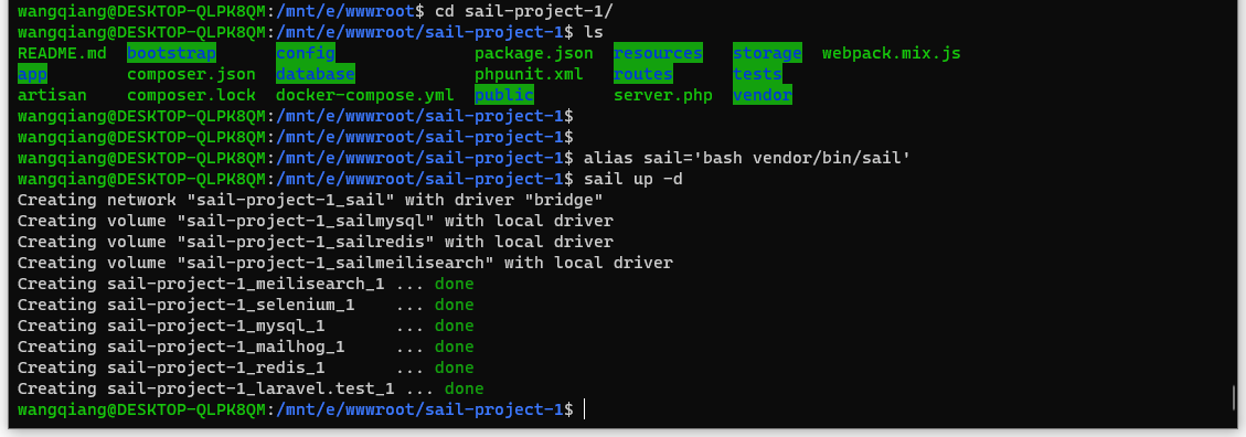 wangqiang@DESKTOP-QLPK8QM:/mnt/e/wwwroot$ cd sail-project-1/ wangqiang@DESKTOP-QLPK8QM:/mnt/e/wwwroot/sail-project-1$ ls README.md bootstrap config package.json resources storage webpack.mix.js app composer.json database phpunit.xml routes tests artisan composer.lock docker-compose.yml public server.php vendor wangqiang@DESKTOP-QLPK8QM:/mnt/e/wwwroot/sail-project-1$ wangqiang@DESKTOP-QLPK8QM:/mnt/e/wwwroot/sail-project-1$ wangqiang@DESKTOP-QLPK8QM:/mnt/e/wwwroot/sail-project-1$ alias sail='bash vendor/bin/sail' wangqiang@DESKTOP-QLPK8QM:/mnt/e/wwwroot/sail-project-1$ sail up -d Creating network "sail-project-1_sail" with driver "bridge" Creating volume "sail-project-1_sailmysql" with local driver Creating volume "sail-project-1_sailredis" with local driver Creating volume "sail-project-1_sailmeilisearch" with local driver Creating sail-project-1_meilisearch_1 ... done Creating sail-project-1_selenium_1 ... done Creating sail-project-1_mysql_1 ... done Creating sail-project-1_mailhog_1 ... done Creating sail-project-1_redis_1 ... done Creating sail-project-1_laravel.test_1 ... done wangqiang@DESKTOP-QLPK8QM:/mnt/e/wwwroot/sail-project-1$