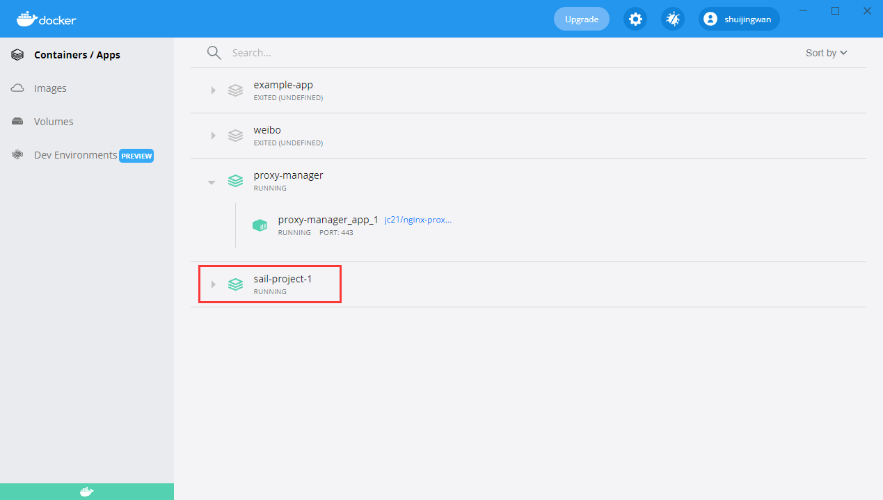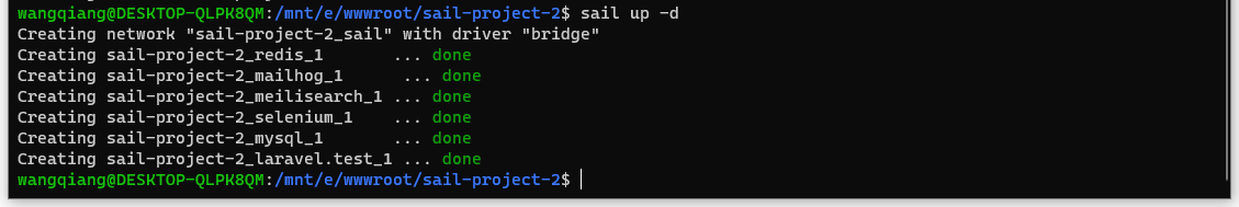 wangqiang@DESKTOP-QLPK8QM:/mnt/e/wwwroot/sail-project-2$ sail up -d Creating network "sail-project-2_sail" with driver "bridge" Creating sail-project-2_redis_1 ... done Creating sail-project-2_mailhog_1 ... done Creating sail-project-2_meilisearch_1 ... done Creating sail-project-2_selenium_1 ... done Creating sail-project-2_mysql_1 ... done Creating sail-project-2_laravel.test_1 ... done