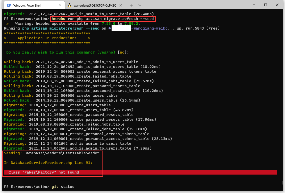 PS E:\wwwroot\weibo> heroku run php artisan migrate:refresh --seed » Warning: heroku update available from 7.53.0 to 7.59.2. Running php artisan migrate:refresh --seed on ⬢ app-wangqiang-weibo... up, run.5843 (Free) ************************************** * Application In Production! * ************************************** Do you really wish to run this command? (yes/no) [no]: Rolling back: 2021_12_24_062642_add_is_admin_to_users_table Rolled back: 2021_12_24_062642_add_is_admin_to_users_table (18.92ms) Rolling back: 2019_12_14_000001_create_personal_access_tokens_table Rolling back: 2019_08_19_000000_create_failed_jobs_table Rolled back: 2019_08_19_000000_create_failed_jobs_table (25.62ms) Rolling back: 2014_10_12_100000_create_password_resets_table Rolled back: 2014_10_12_100000_create_password_resets_table (10.26ms) Rolling back: 2014_10_12_000000_create_users_table Rolled back: 2014_10_12_000000_create_users_table (26.54ms) Migrating: 2014_10_12_000000_create_users_table Migrated: 2014_10_12_000000_create_users_table (46.62ms) Migrating: 2014_10_12_100000_create_password_resets_table Migrated: 2014_10_12_100000_create_password_resets_table (17.96ms) Migrating: 2019_08_19_000000_create_failed_jobs_table Migrated: 2019_08_19_000000_create_failed_jobs_table (29.18ms) Migrating: 2019_12_14_000001_create_personal_access_tokens_table Migrated: 2019_12_14_000001_create_personal_access_tokens_table (28.13ms) Migrating: 2021_12_24_062642_add_is_admin_to_users_table Migrated: 2021_12_24_062642_add_is_admin_to_users_table (7.20ms) Seeding: Database\Seeders\UsersTableSeeder In DatabaseServiceProvider.php line 91: Class "Faker\Factory" not found