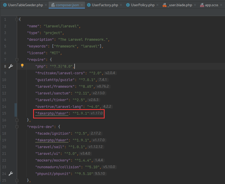 2、编辑 composer.json ,将 “require-dev” 中的 “fakerphp/faker” 复制到 “require” 里面。如图2
