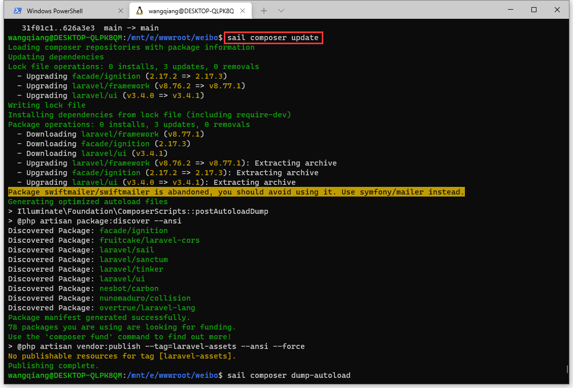 wangqiang@DESKTOP-QLPK8QM:/mnt/e/wwwroot/weibo$ sail composer update Loading composer repositories with package information Updating dependencies Lock file operations: 0 installs, 3 updates, 0 removals - Upgrading facade/ignition (2.17.2 => 2.17.3) - Upgrading laravel/framework (v8.76.2 => v8.77.1) - Upgrading laravel/ui (v3.4.0 => v3.4.1) Writing lock file Installing dependencies from lock file (including require-dev) Package operations: 0 installs, 3 updates, 0 removals - Downloading laravel/framework (v8.77.1) - Downloading facade/ignition (2.17.3) - Downloading laravel/ui (v3.4.1) - Upgrading laravel/framework (v8.76.2 => v8.77.1): Extracting archive - Upgrading facade/ignition (2.17.2 => 2.17.3): Extracting archive - Upgrading laravel/ui (v3.4.0 => v3.4.1): Extracting archive Package swiftmailer/swiftmailer is abandoned, you should avoid using it. Use symfony/mailer instead. Generating optimized autoload files > Illuminate\Foundation\ComposerScripts::postAutoloadDump > @php artisan package:discover --ansi Discovered Package: facade/ignition Discovered Package: fruitcake/laravel-cors Discovered Package: laravel/sail Discovered Package: laravel/sanctum Discovered Package: laravel/tinker Discovered Package: laravel/ui Discovered Package: nesbot/carbon Discovered Package: nunomaduro/collision Discovered Package: overtrue/laravel-lang Package manifest generated successfully. 78 packages you are using are looking for funding. Use the `composer fund` command to find out more! > @php artisan vendor:publish --tag=laravel-assets --ansi --force No publishable resources for tag [laravel-assets]. Publishing complete. wangqiang@DESKTOP-QLPK8QM:/mnt/e/wwwroot/weibo$ sail composer dump-autoload Generating optimized autoload files > Illuminate\Foundation\ComposerScripts::postAutoloadDump > @php artisan package:discover --ansi Discovered Package: facade/ignition Discovered Package: fruitcake/laravel-cors Discovered Package: laravel/sail Discovered Package: laravel/sanctum Discovered Package: laravel/tinker Discovered Package: laravel/ui Discovered Package: nesbot/carbon Discovered Package: nunomaduro/collision Discovered Package: overtrue/laravel-lang Package manifest generated successfully. Generated optimized autoload files containing 5031 classes wangqiang@DESKTOP-QLPK8QM:/mnt/e/wwwroot/weibo$