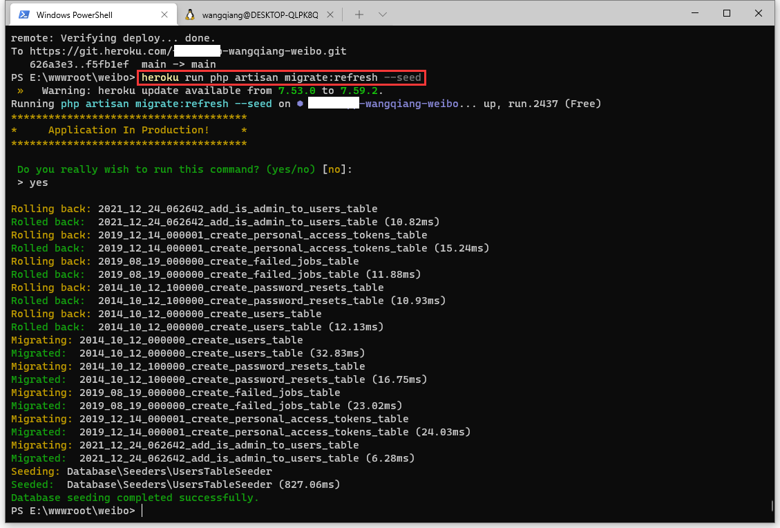 4、再次推送至 Heroku,执行填充,不再报错。如图4