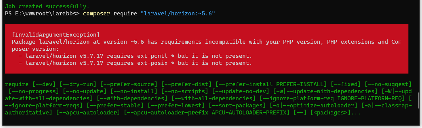 PS E:\wwwroot\larabbs> composer require "laravel/horizon:~5.6"