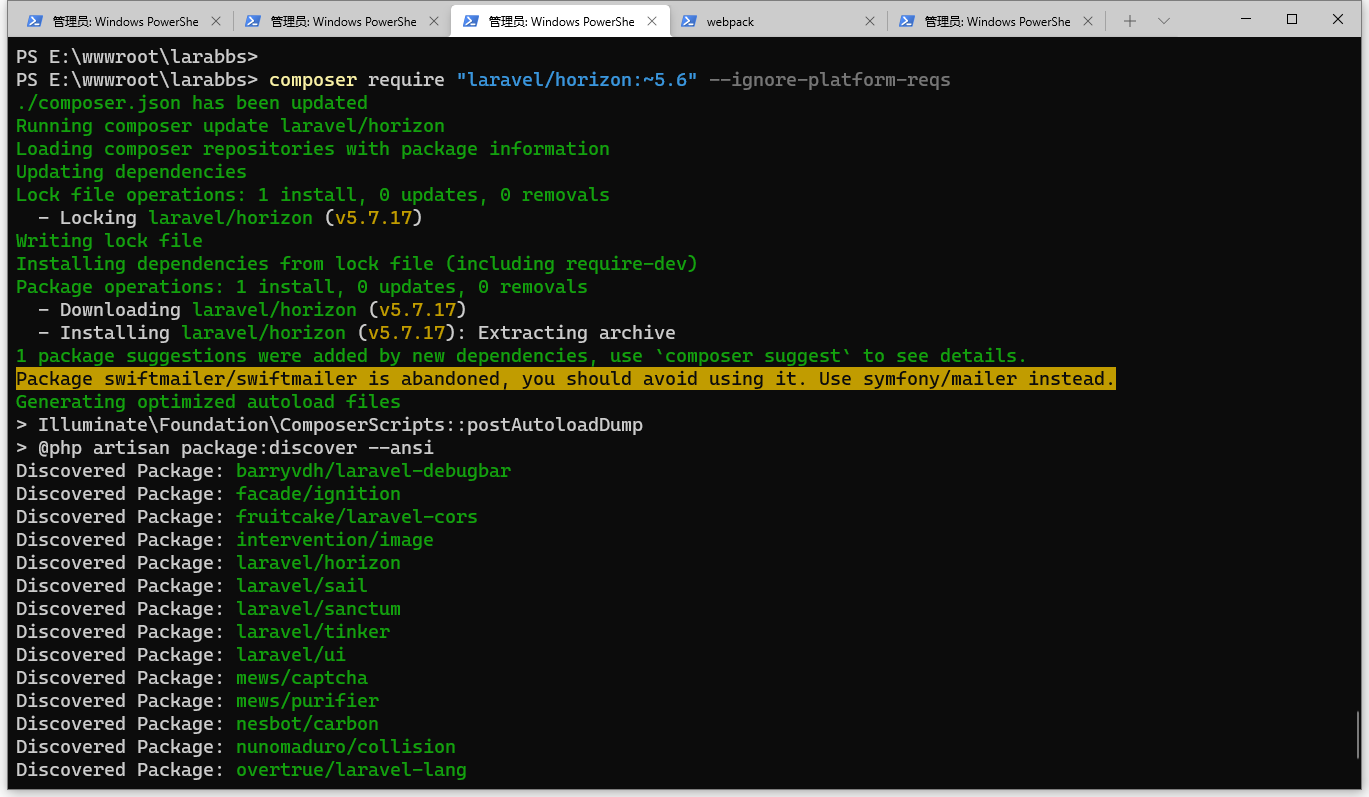 PS E:\wwwroot\larabbs> composer require "laravel/horizon:~5.6" --ignore-platform-reqs ./composer.json has been updated Running composer update laravel/horizon Loading composer repositories with package information Updating dependencies Lock file operations: 1 install, 0 updates, 0 removals - Locking laravel/horizon (v5.7.17) Writing lock file Installing dependencies from lock file (including require-dev) Package operations: 1 install, 0 updates, 0 removals - Downloading laravel/horizon (v5.7.17) - Installing laravel/horizon (v5.7.17): Extracting archive 1 package suggestions were added by new dependencies, use `composer suggest` to see details. Package swiftmailer/swiftmailer is abandoned, you should avoid using it. Use symfony/mailer instead. Generating optimized autoload files > Illuminate\Foundation\ComposerScripts::postAutoloadDump > @php artisan package:discover --ansi Discovered Package: barryvdh/laravel-debugbar Discovered Package: facade/ignition Discovered Package: fruitcake/laravel-cors Discovered Package: intervention/image Discovered Package: laravel/horizon Discovered Package: laravel/sail Discovered Package: laravel/sanctum Discovered Package: laravel/tinker Discovered Package: laravel/ui Discovered Package: mews/captcha Discovered Package: mews/purifier Discovered Package: nesbot/carbon Discovered Package: nunomaduro/collision Discovered Package: overtrue/laravel-lang Discovered Package: summerblue/generator Discovered Package: summerblue/laravel-active Package manifest generated successfully. 83 packages you are using are looking for funding. Use the `composer fund` command to find out more! > @php artisan vendor:publish --tag=laravel-assets --ansi --force Copied Directory [\vendor\laravel\horizon\public] To [\public\vendor\horizon] Publishing complete. PS E:\wwwroot\larabbs>