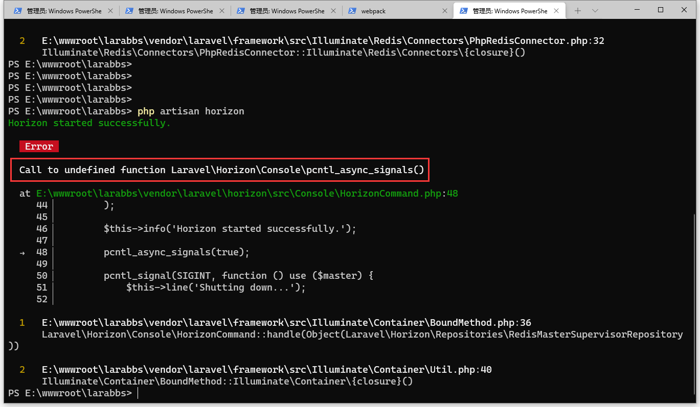 5、只不过不能够使用 horizon 命令来启动队列系统和任务监控。报错:Call to undefined function Laravel\Horizon\Console\pcntl_async_signals() 。如图5