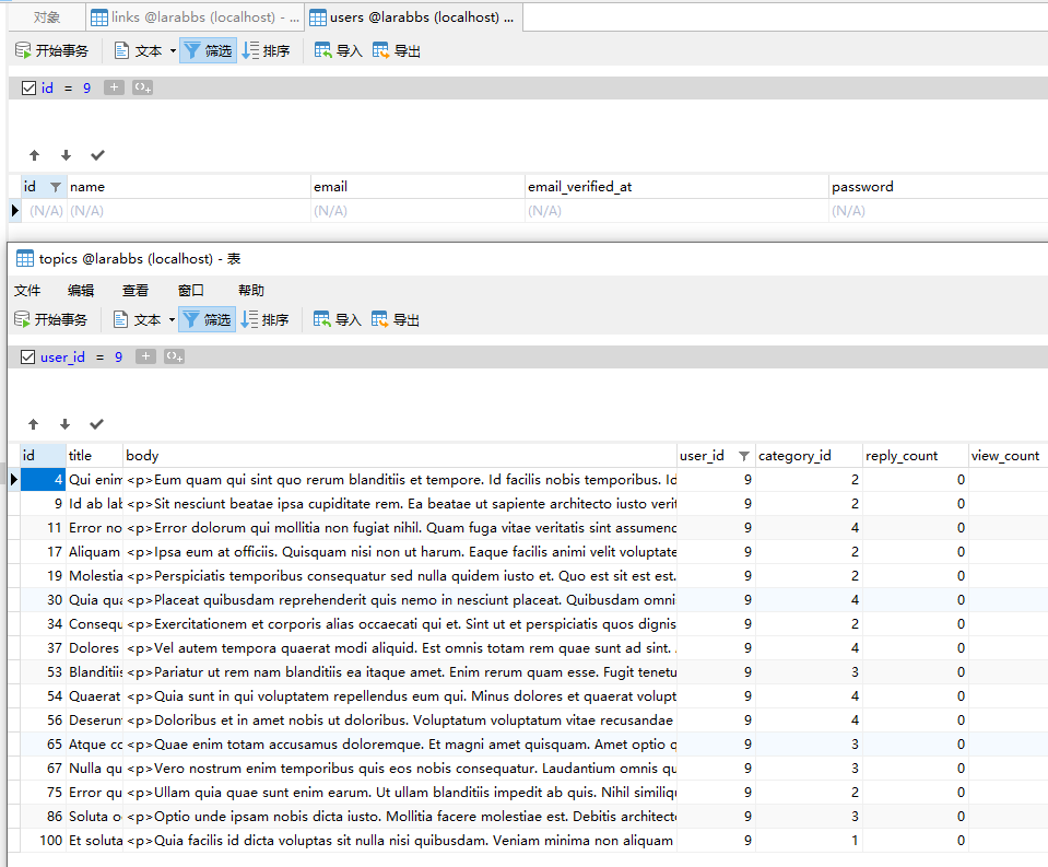 2、分析原因,用户ID等于 9 的记录在 topics 中存在,但是在 users 中已经不存在所导致。如图2