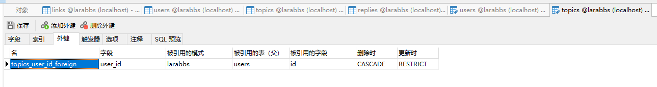 SQLSTATE[23000]: Integrity constraint violation: 1452 Cannot add or update a child row: a foreign key constraint fails (`larabbs`.`#sql-13d0_5a1`, CONSTRAINT `topics_user_id_foreign` FOREIGN KEY (`user_id`) REFERENCES `users` (`id`) ON DELETE CASCADE) (SQL: alter table `topics` add constraint `topics_user_id_foreign` foreign key (`user_id`) references `users` (`id`) on delete cascade)
