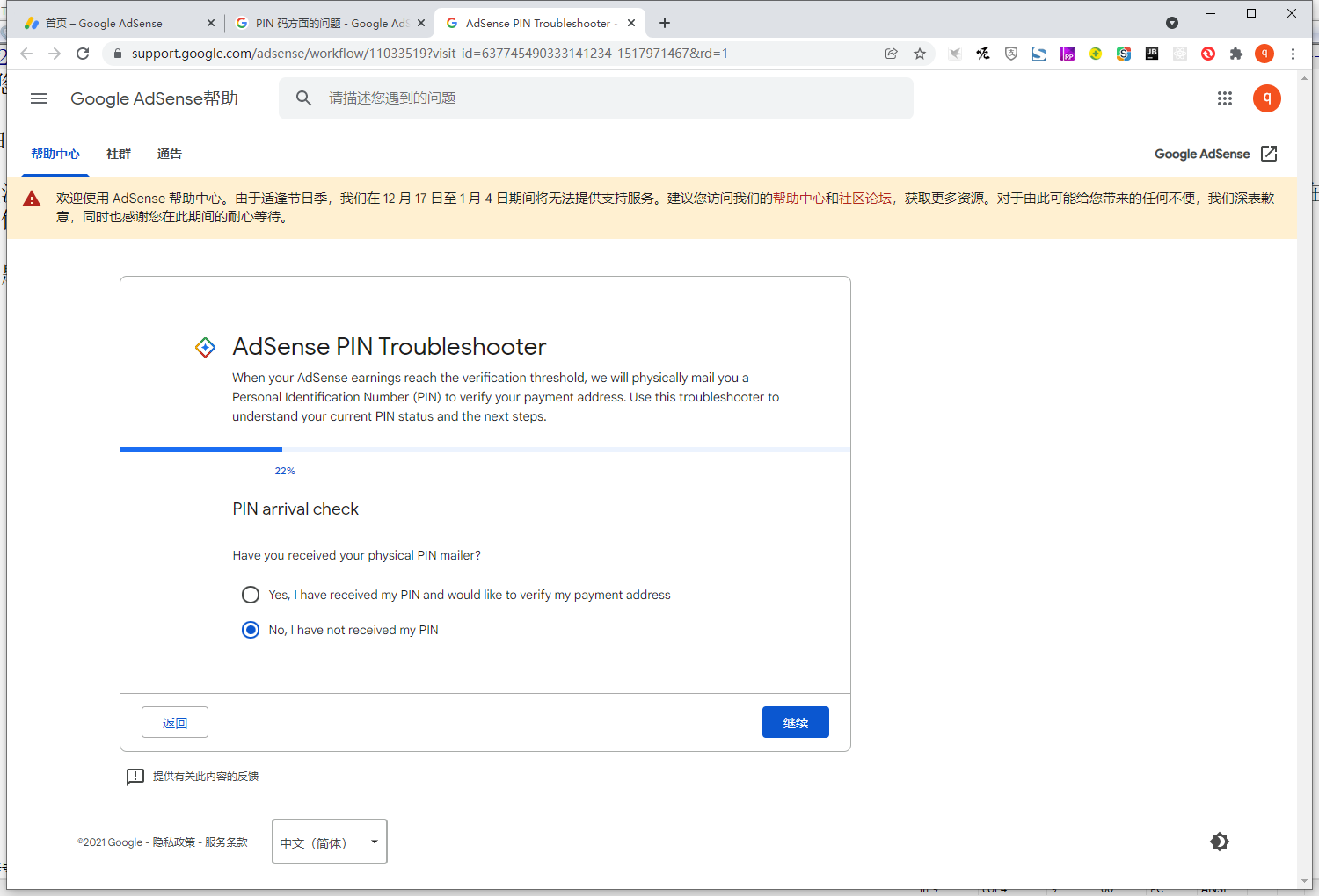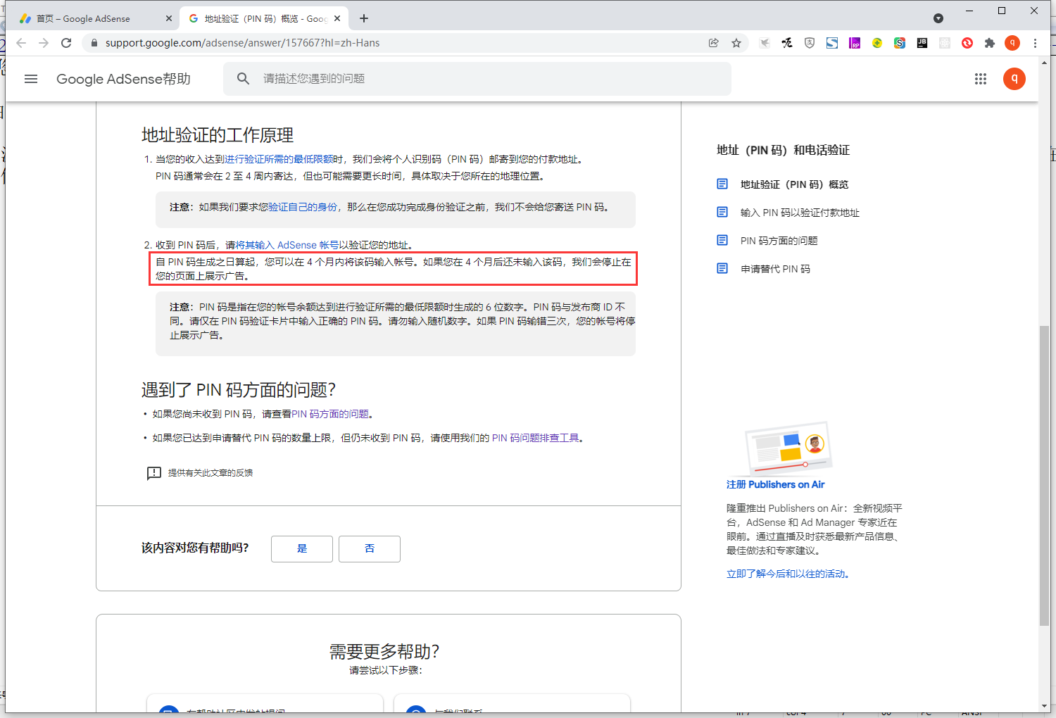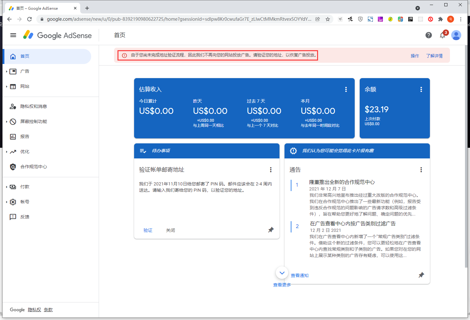Google Adsense 由于您尚未完成地址验证流程,因此我们不再向您的网站投放广告。请验证您的地址,以恢复广告投放