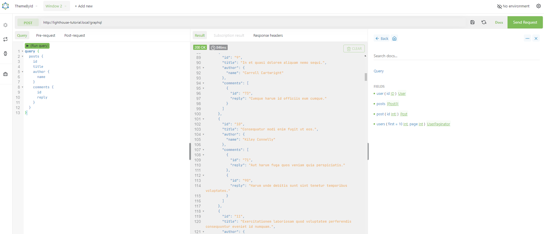 17、执行数据填充成功后,访问 /graphql 并尝试以下的查询。获取到数据库中所有 posts 的列表,以及全部 comments 和 user 的 name。符合预期。如图6