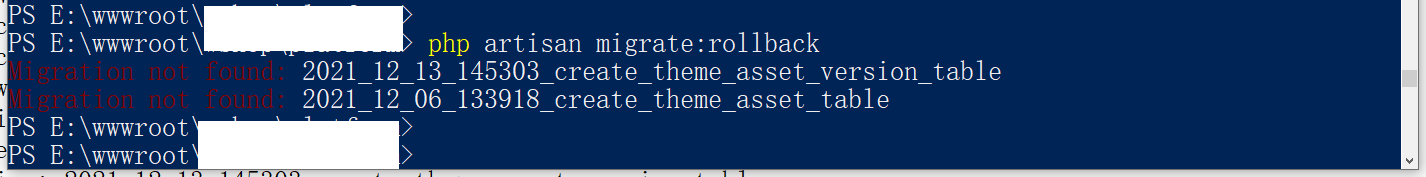 PS E:\wwwroot\object> php artisan migrate:rollback Migration not found: 2021_12_13_145303_create_theme_asset_version_table Migration not found: 2021_12_06_133918_create_theme_asset_table PS E:\wwwroot\object>