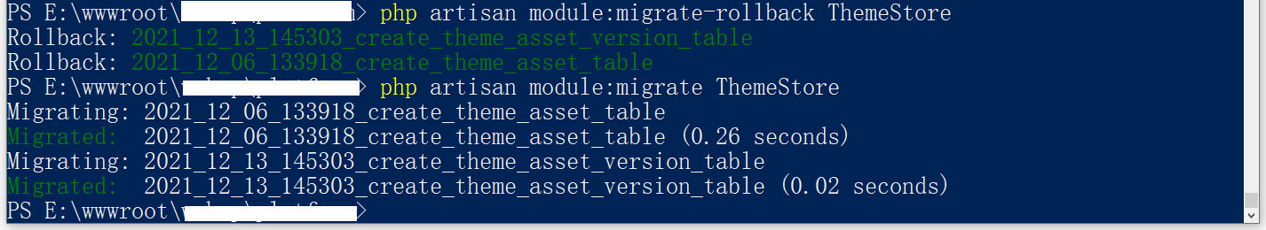 PS E:\wwwroot\object> php artisan module:migrate-rollback ThemeStore Rollback: 2021_12_13_145303_create_theme_asset_version_table Rollback: 2021_12_06_133918_create_theme_asset_table PS E:\wwwroot\object> php artisan module:migrate ThemeStore Migrating: 2021_12_06_133918_create_theme_asset_table Migrated: 2021_12_06_133918_create_theme_asset_table (0.26 seconds) Migrating: 2021_12_13_145303_create_theme_asset_version_table Migrated: 2021_12_13_145303_create_theme_asset_version_table (0.02 seconds) PS E:\wwwroot\object>