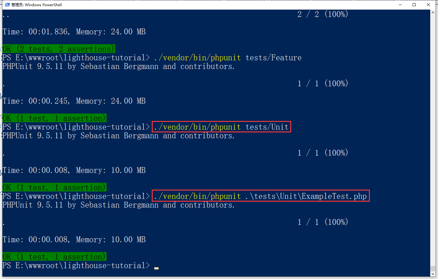 PS E:\wwwroot\lighthouse-tutorial> ./vendor/bin/phpunit tests/Unit PHPUnit 9.5.11 by Sebastian Bergmann and contributors. . 1 / 1 (100%) Time: 00:00.008, Memory: 10.00 MB OK (1 test, 1 assertion) PS E:\wwwroot\lighthouse-tutorial> ./vendor/bin/phpunit .\tests\Unit\ExampleTest.php PHPUnit 9.5.11 by Sebastian Bergmann and contributors. . 1 / 1 (100%) Time: 00:00.008, Memory: 10.00 MB OK (1 test, 1 assertion)