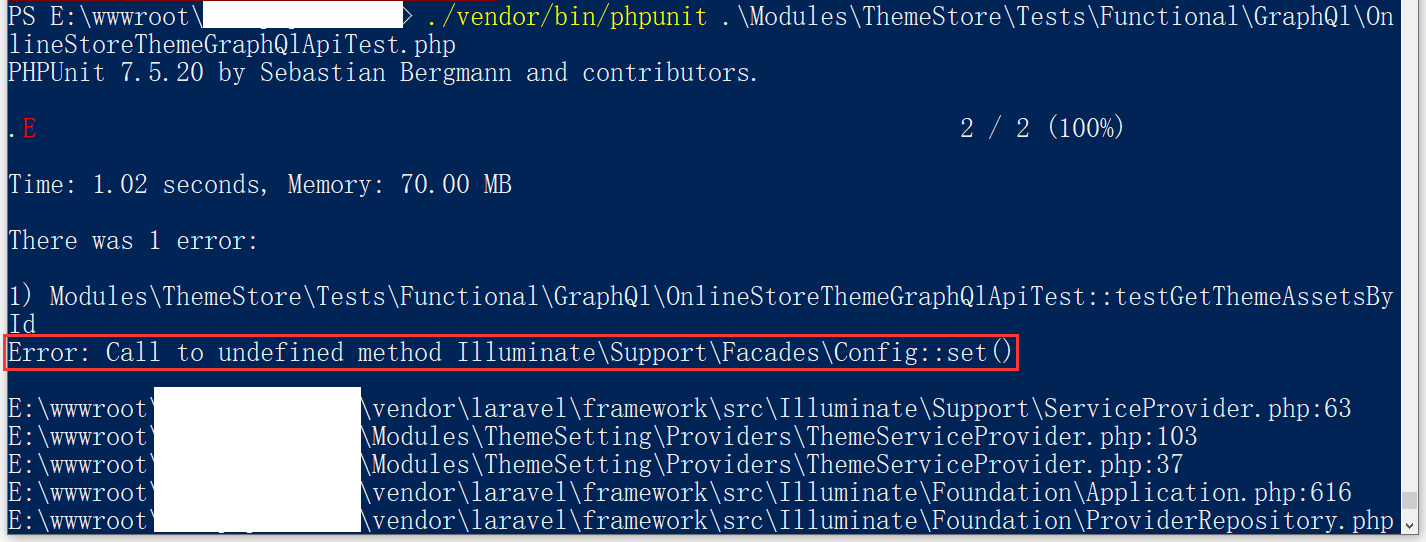 PS E:\wwwroot\object> ./vendor/bin/phpunit .\Modules\ThemeStore\Tests\Functional\GraphQl\OnlineStoreThemeGraphQlApiTest.php PHPUnit 7.5.20 by Sebastian Bergmann and contributors. .E 2 / 2 (100%) Time: 1.02 seconds, Memory: 70.00 MB There was 1 error: 1) Modules\ThemeStore\Tests\Functional\GraphQl\OnlineStoreThemeGraphQlApiTest::testGetThemeAssetsById Error: Call to undefined method Illuminate\Support\Facades\Config::set() E:\wwwroot\object\vendor\laravel\framework\src\Illuminate\Support\ServiceProvider.php:63 E:\wwwroot\object\Modules\ThemeSetting\Providers\ThemeServiceProvider.php:103 E:\wwwroot\object\Modules\ThemeSetting\Providers\ThemeServiceProvider.php:37 E:\wwwroot\object\vendor\laravel\framework\src\Illuminate\Foundation\Application.php:616 E:\wwwroot\object\vendor\laravel\framework\src\Illuminate\Foundation\ProviderRepository.php:75 E:\wwwroot\object\vendor\nwidart\laravel-modules\src\Laravel\Module.php:33 E:\wwwroot\object\vendor\nwidart\laravel-modules\src\Module.php:264 E:\wwwroot\object\vendor\nwidart\laravel-modules\src\FileRepository.php:321 E:\wwwroot\object\vendor\nwidart\laravel-modules\src\Providers\BootstrapServiceProvider.php:23 E:\wwwroot\object\vendor\laravel\framework\src\Illuminate\Foundation\Application.php:616 E:\wwwroot\object\vendor\nwidart\laravel-modules\src\ModulesServiceProvider.php:31 E:\wwwroot\object\vendor\nwidart\laravel-modules\src\LaravelModulesServiceProvider.php:17 E:\wwwroot\object\vendor\laravel\framework\src\Illuminate\Container\BoundMethod.php:36 E:\wwwroot\object\vendor\laravel\framework\src\Illuminate\Container\Util.php:37 E:\wwwroot\object\vendor\laravel\framework\src\Illuminate\Container\BoundMethod.php:93 E:\wwwroot\object\vendor\laravel\framework\src\Illuminate\Container\BoundMethod.php:37 E:\wwwroot\object\vendor\laravel\framework\src\Illuminate\Container\Container.php:590 E:\wwwroot\object\vendor\laravel\framework\src\Illuminate\Foundation\Application.php:856 E:\wwwroot\object\vendor\laravel\framework\src\Illuminate\Foundation\Application.php:839 E:\wwwroot\object\vendor\laravel\framework\src\Illuminate\Foundation\Application.php:840 E:\wwwroot\object\vendor\laravel\framework\src\Illuminate\Foundation\Bootstrap\BootProviders.php:17 E:\wwwroot\object\vendor\laravel\framework\src\Illuminate\Foundation\Application.php:219 E:\wwwroot\object\vendor\laravel\framework\src\Illuminate\Foundation\Console\Kernel.php:320 E:\wwwroot\object\tests\CreatesApplication.php:18 E:\wwwroot\object\vendor\laravel\framework\src\Illuminate\Foundation\Testing\TestCase.php:102 E:\wwwroot\object\vendor\laravel\framework\src\Illuminate\Foundation\Testing\TestCase.php:81 E:\wwwroot\object\Modules\ThemeStore\Tests\Functional\GraphQl\OnlineStoreThemeGraphQlApiTest.php:74 phpvfscomposer://E:\wwwroot\object\vendor\phpunit\phpunit\phpunit:60 ERRORS! Tests: 2, Assertions: 1, Errors: 1. PS E:\wwwroot\object>