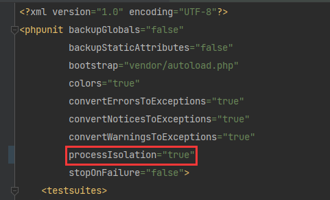 6、参考网址:https://phpunit.readthedocs.io/en/9.5/configuration.html 。processIsolation 属性。This attribute configures whether each test should be run in a separate PHP process for increased isolation。可能的值:true 或 false(默认值:false)。此属性配置每个测试是否应在单独的 PHP 进程中运行以增加隔离。