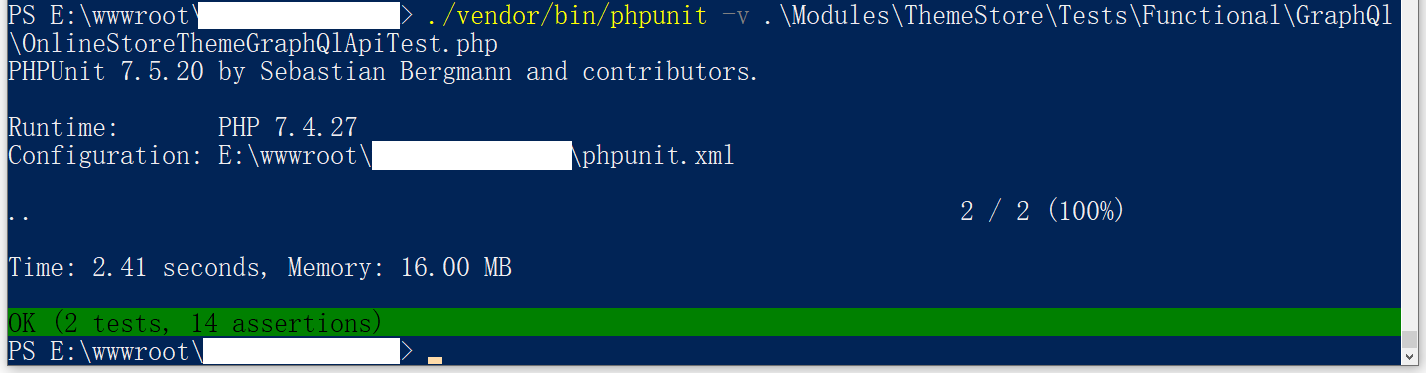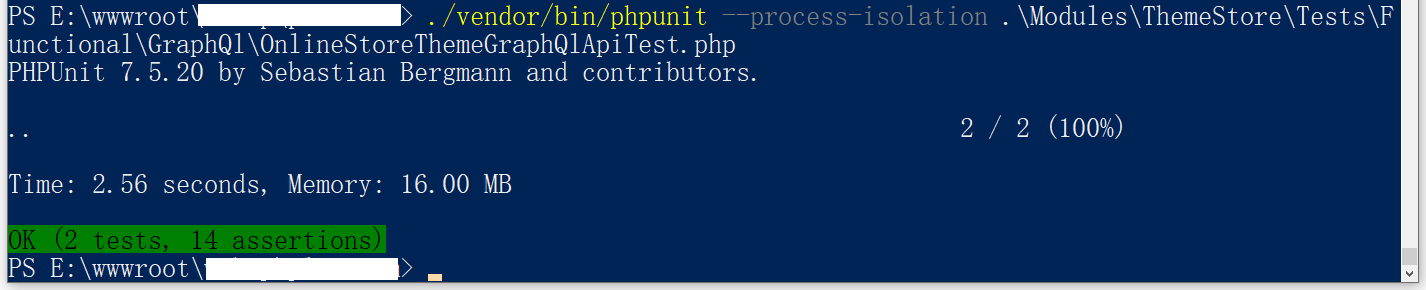 PS E:\wwwroot\object> ./vendor/bin/phpunit --process-isolation .\Modules\ThemeStore\Tests\Functional\GraphQl\OnlineStoreThemeGraphQlApiTest.php PHPUnit 7.5.20 by Sebastian Bergmann and contributors. .. 2 / 2 (100%) Time: 2.56 seconds, Memory: 16.00 MB OK (2 tests, 14 assertions) PS E:\wwwroot\object>