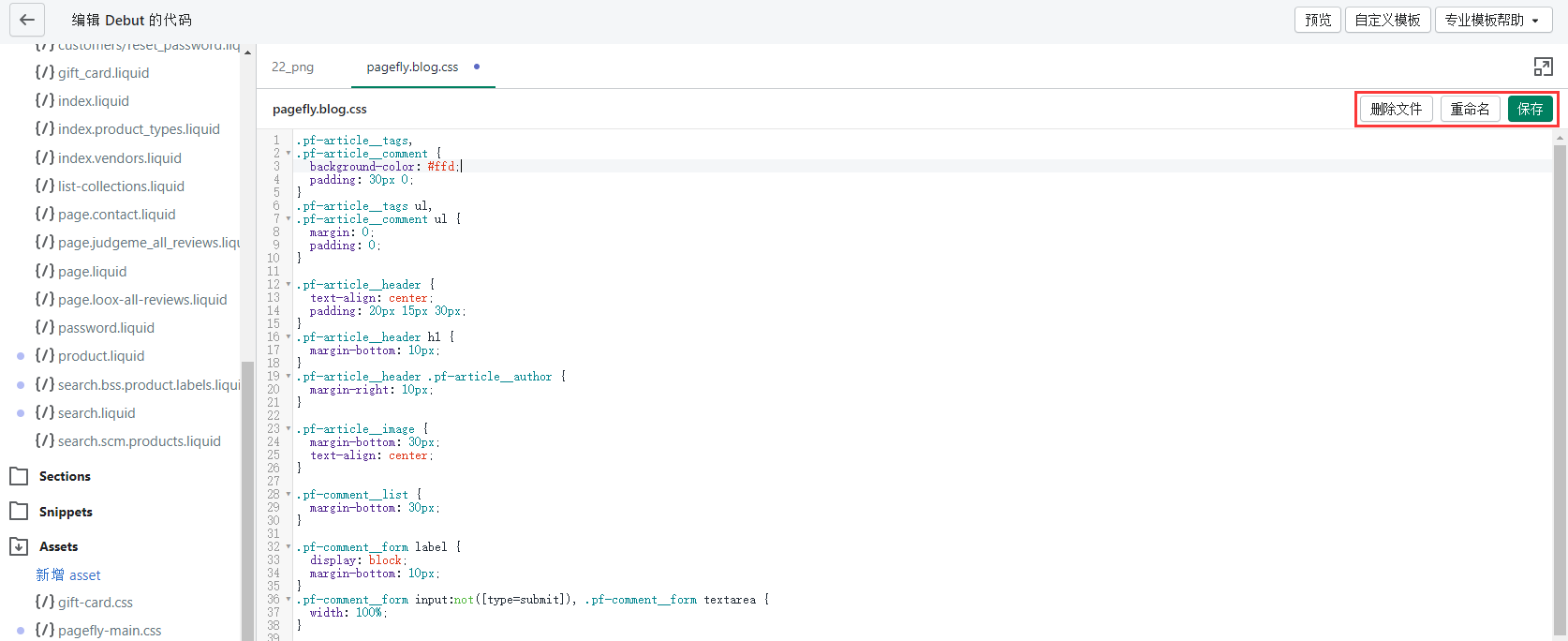1、左侧为一个主题素材的列表,用户每点击一个素材,其操作按钮:删除文件、重命名、保存,会随着素材的变化而变化。如图1