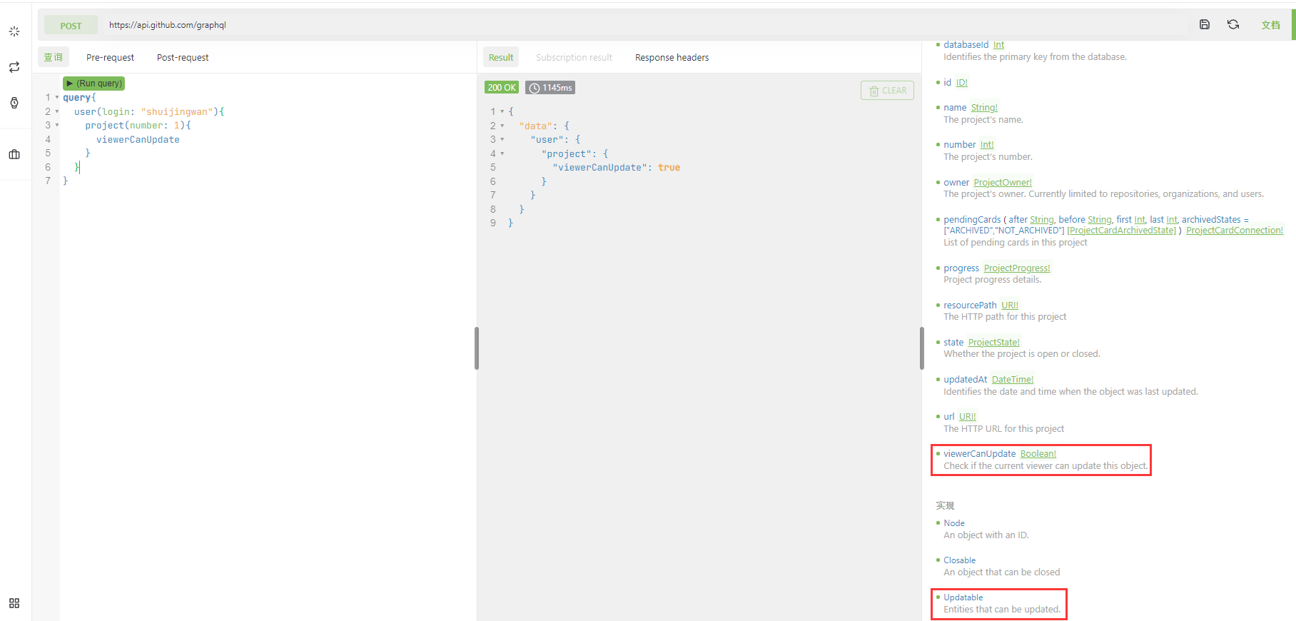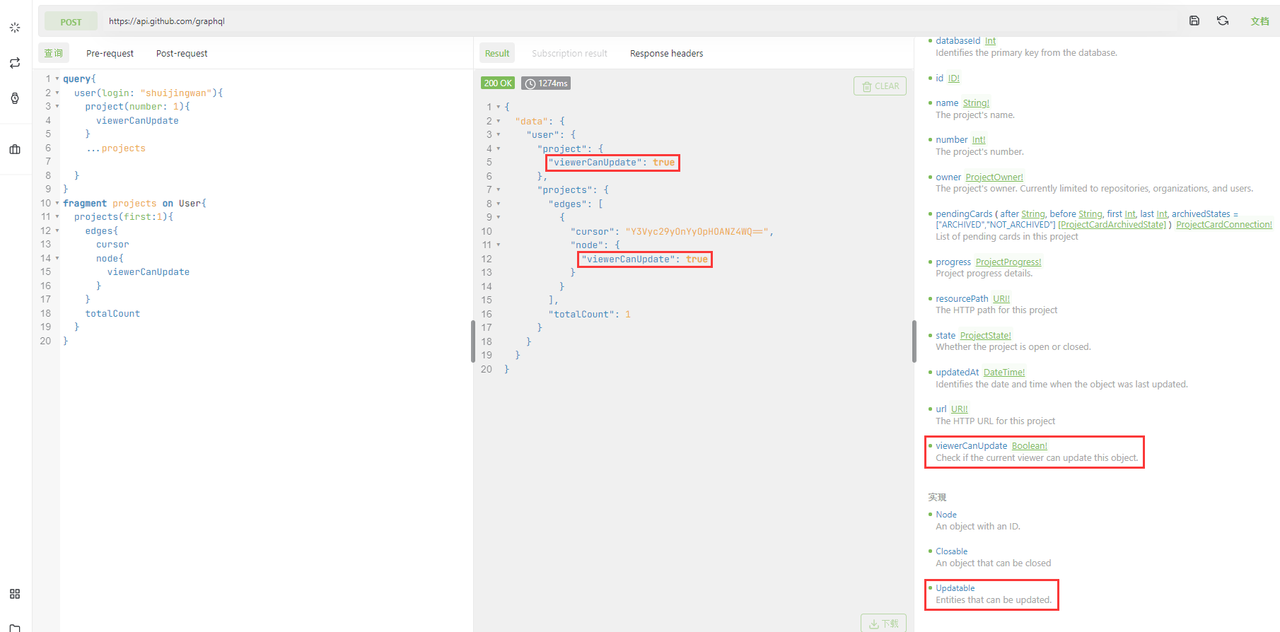 13、查询用户下的项目编号为 1 ,分别获取单个项目与项目列表,viewerCanUpdate 。如图13