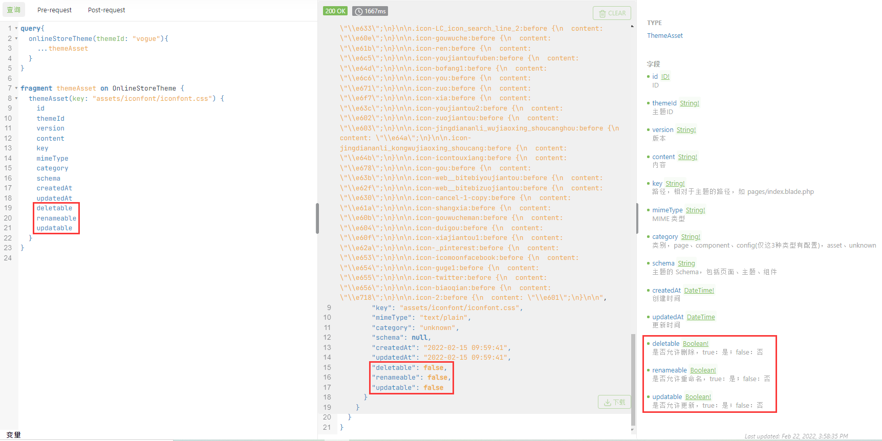 14、最终决定实现 类型 themeAsset(key:String!),在响应字段中添加:deletable、renameable、updatable。如图14