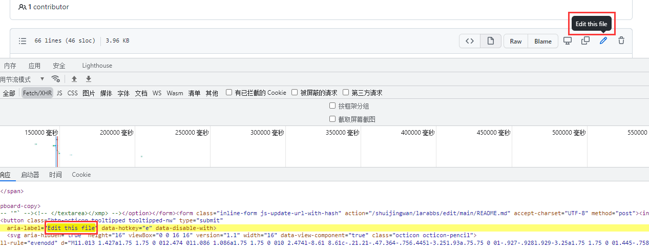 4、查看 GitHub 上的获取文件的 页面的网络请求 ,查看 README.md,请求网址: https://github.com/shuijingwan/larabbs/blob/main/README.md ,其响应为 HTML 结构,但是其允许操作:编辑文件、删除文件。如图4