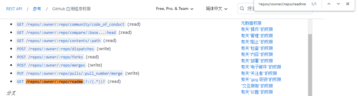 6、查看 GitHub 应用程序权限,搜索:/repos/:owner/:repo/readme,其仅标注此接口是一个读取类型。并未针对基于具体的当前用户与具体的文件,而设置一些更为具体的操作权限。此属于接口内部的细分权限。如图6