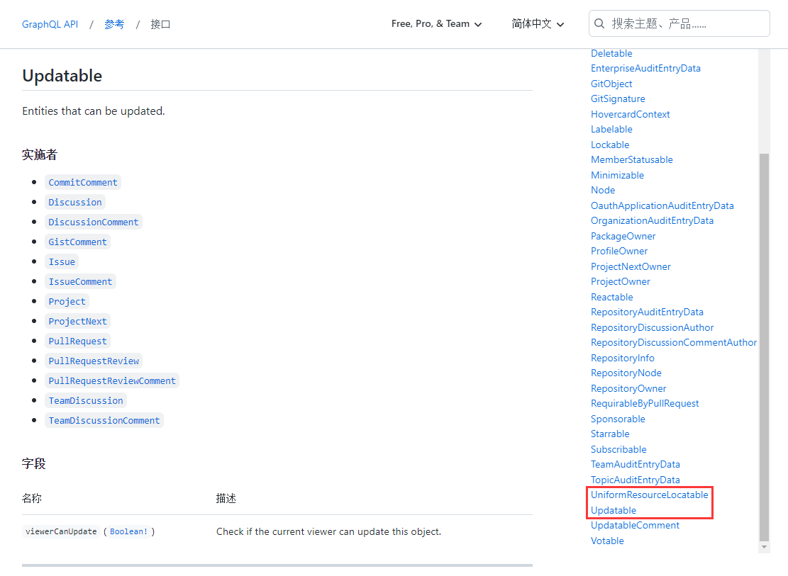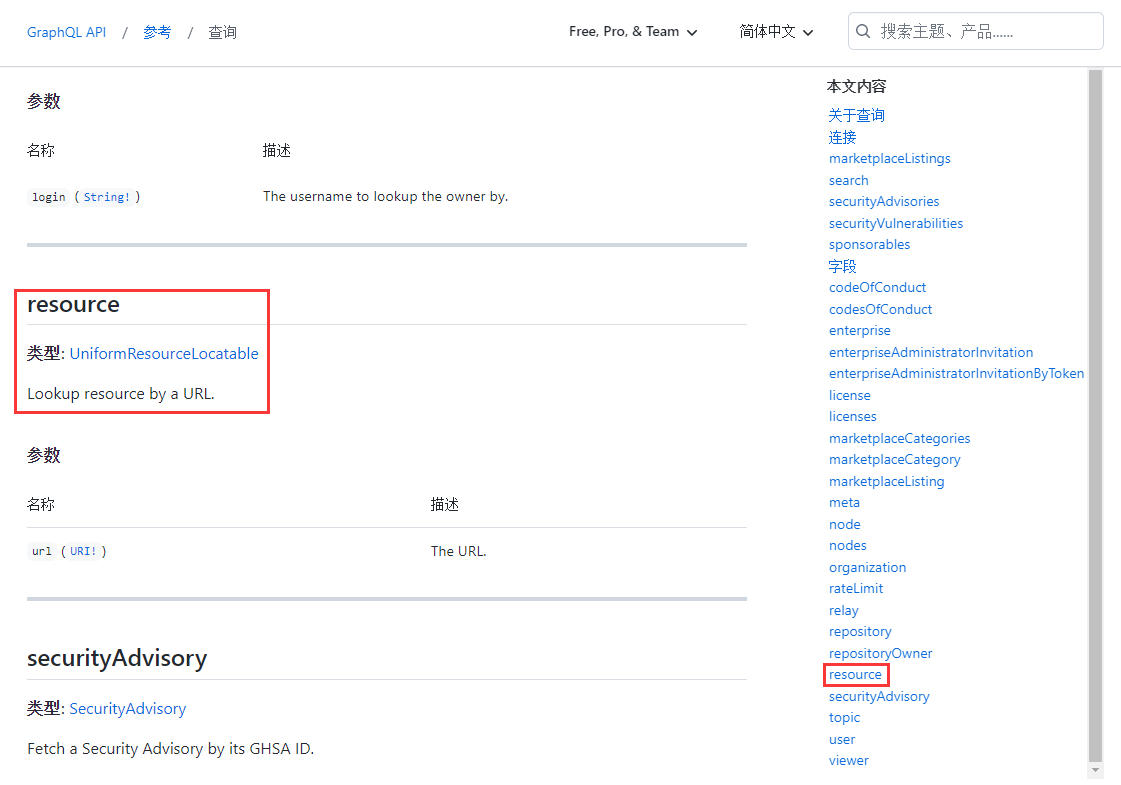 7、查看 GitHub 上的获取文件的 GraphQL API,请求:resource ,其响应为类型: UniformResourceLocatable。如图7