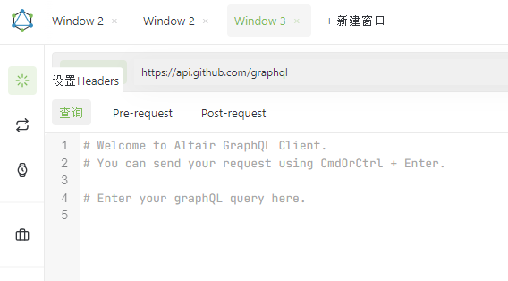 9、参考使用 Explorer,我计划在 Altair 中请求。新建窗口:https://api.github.com/graphql ,点击左上角的 设置Headers。如图9
