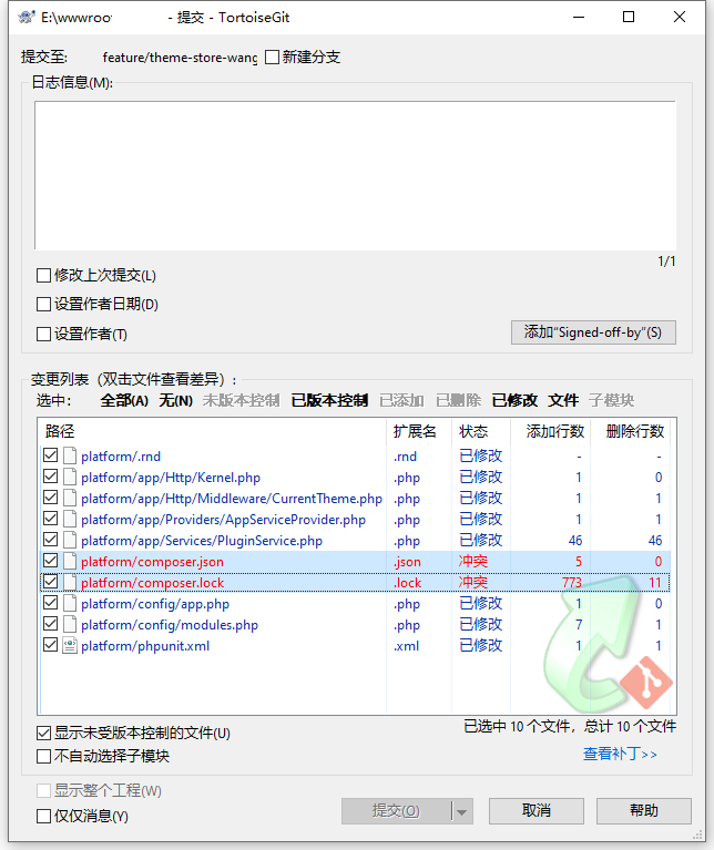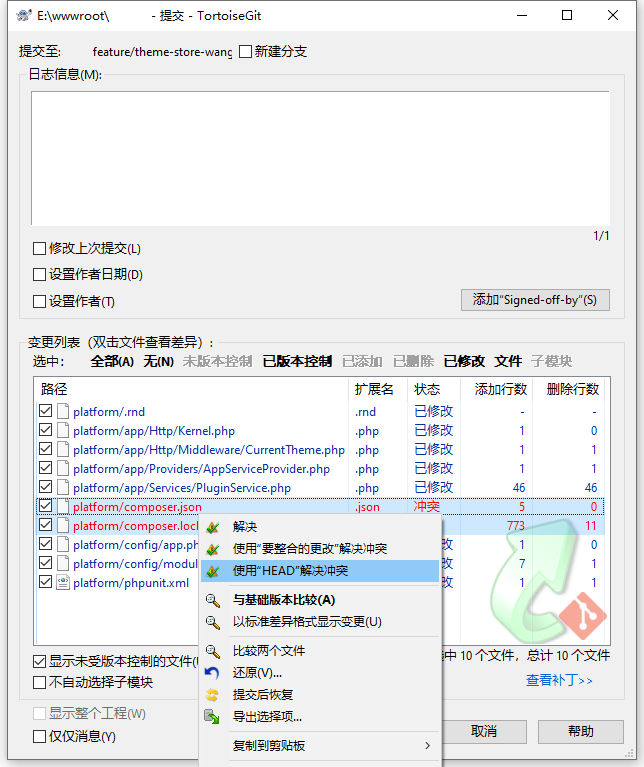 5、在 TortoiseGit 中,Git 提交,存在冲突文件:platform/composer.json、platform/composer.lock。如图1