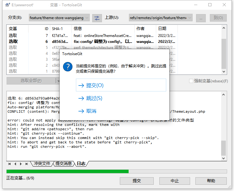 16、当前提交将是空的 (例如,由于解决冲突)。跳过此提交或者只保留提交消息?选择提交。如图9