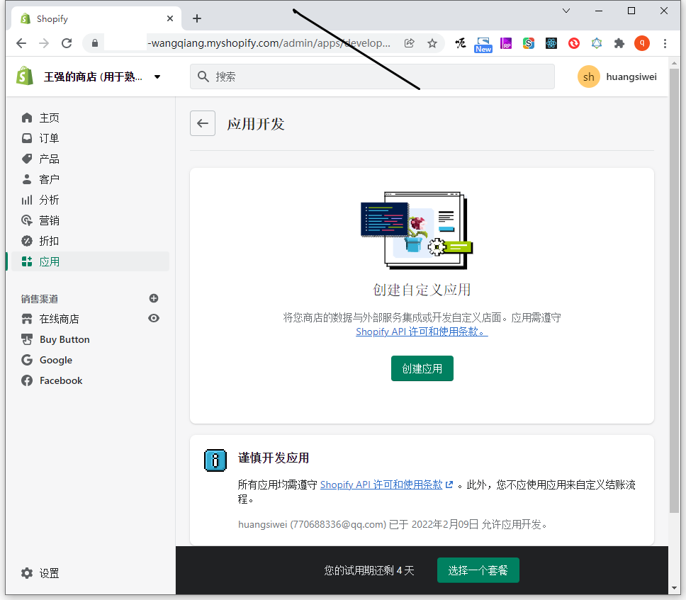 2、打开后台 – 应用 – 开发应用 – 创建自定义应用。如图1