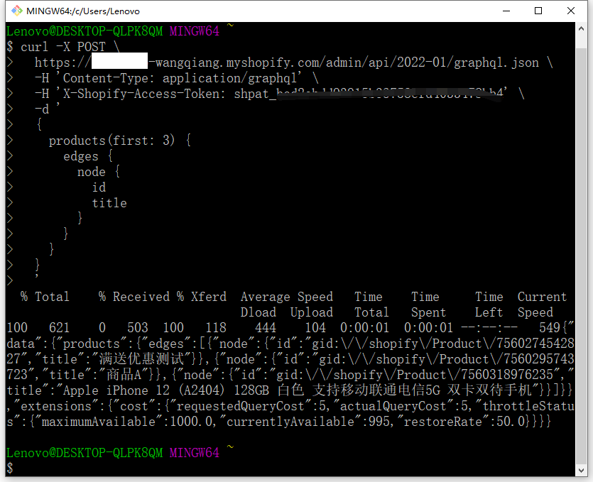 100 621 0 503 100 118 479 112 0:00:01 0:00:01 --:--:-- 593{"data":{"products":{"edges":[{"node":{"id":"gid:\/\/shopify\/Product\/7560274542827","title":"满送优惠测试"}},{"node":{"id":"gid:\/\/shopify\/Product\/7560295743723","title":"商品A"}},{"node":{"id":"gid:\/\/shopify\/Product\/7560318976235","title":"Apple iPhone 12 (A2404) 128GB 白色 支持移动联通电信5G 双卡双待手机"}}]}},"extensions":{"cost":{"requestedQueryCost":5,"actualQueryCost":5,"throttleStatus":{"maximumAvailable":1000.0,"currentlyAvailable":995,"restoreRate":50.0}}}}