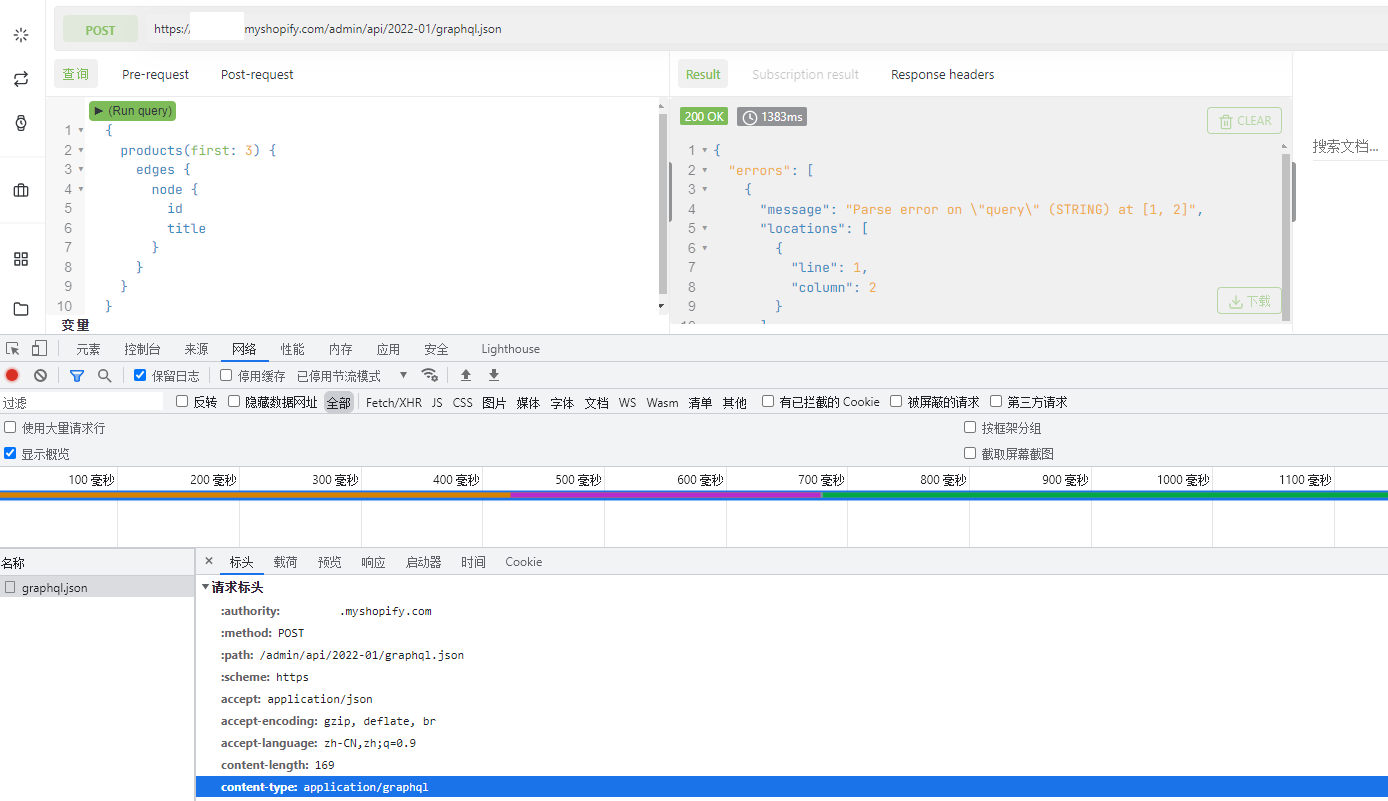 12、参考: https://shopify.dev/api/admin/getting-started#use-curl 。如果您使用的是 HTTP 客户端,例如 Postman 或 Insomnia,则必须将 Content-Type 设置为 application/json 而不是 application/graphql。重新设置 Headers ,Content-Type: application/json。仍然响应 404。当切换为一个正式的商店后,响应 200。如图11