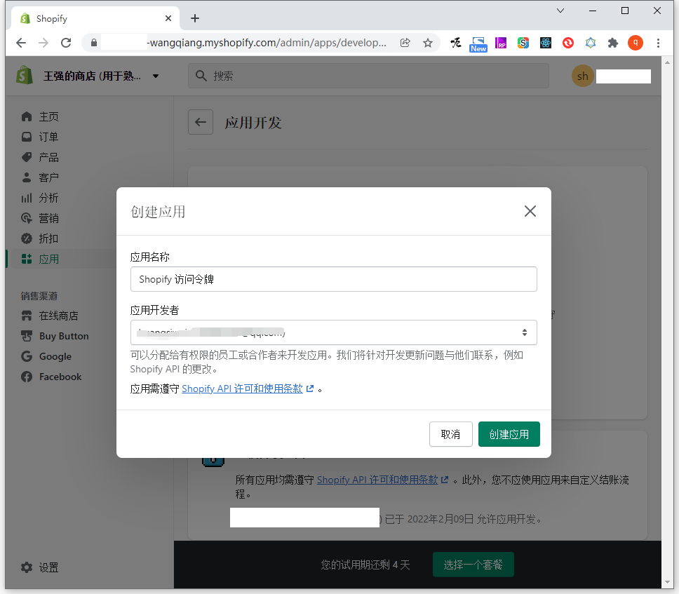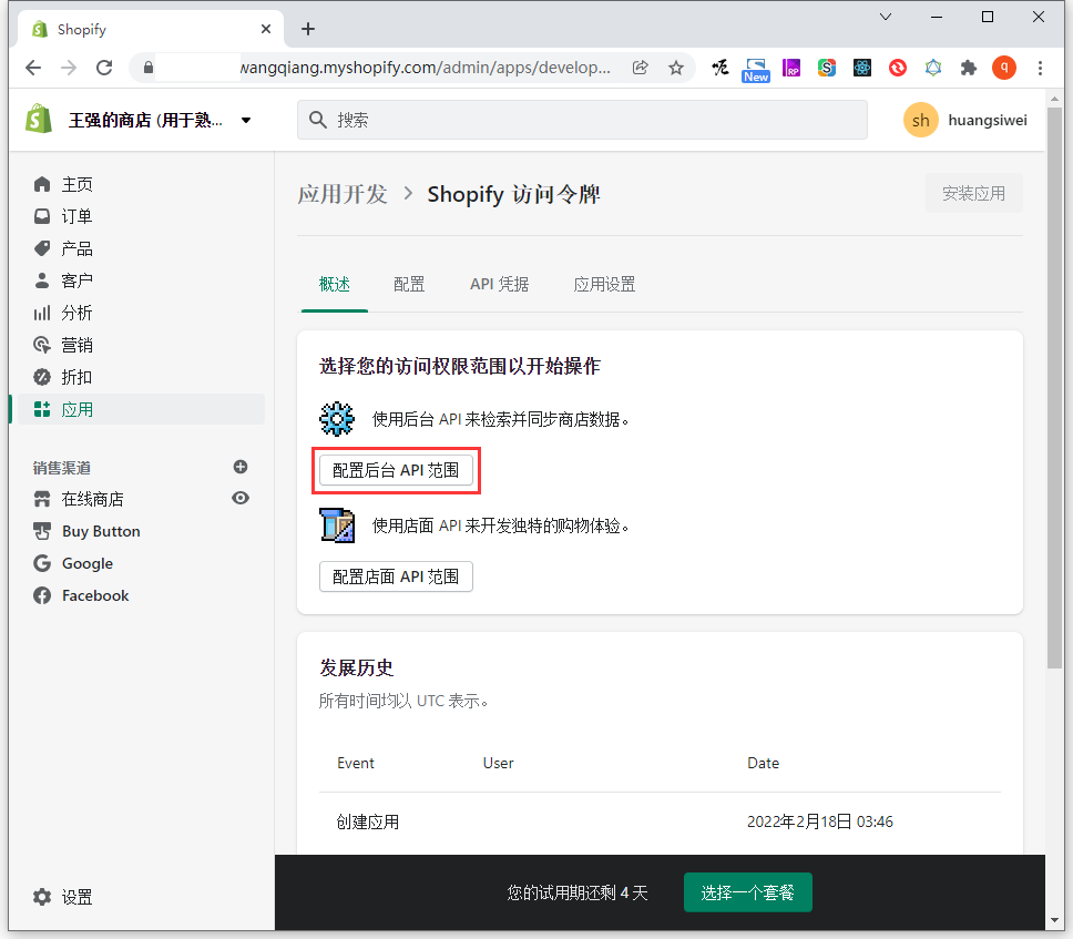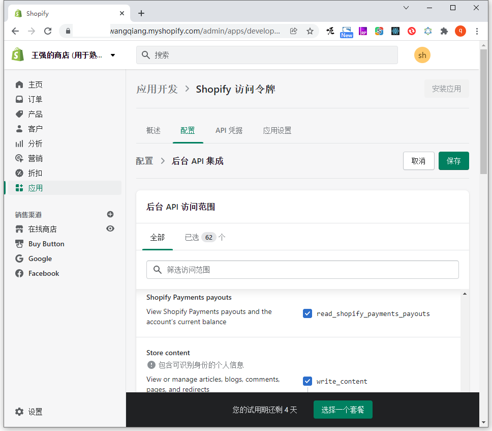 5、应用开发 – Shopify 访问令牌 – 配置 – 后台 API 集成 – 选择访问范围 – 保存。如图4