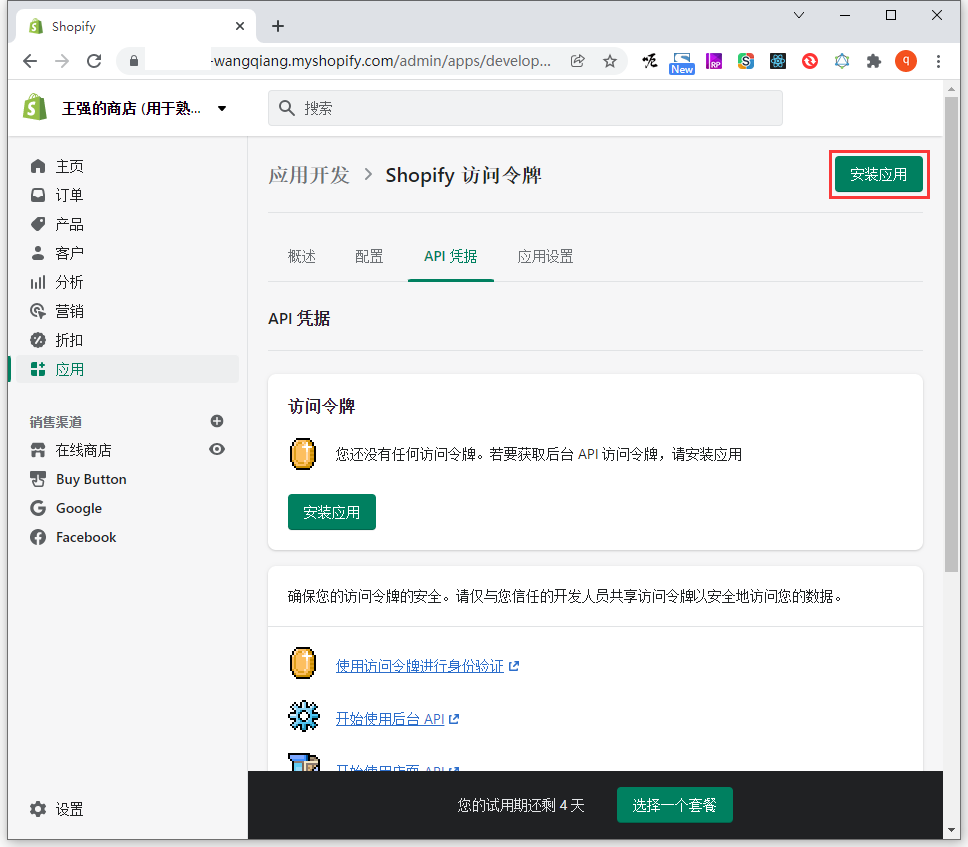 6、API 凭据,您还没有任何访问令牌。若要获取后台 API 访问令牌,请安装应用。安装应用。如图5