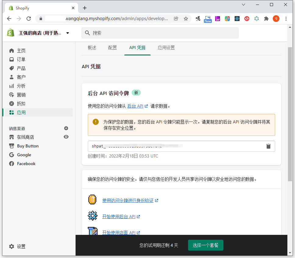 7、API 凭据 – 后台 API 访问令牌。为保护您的数据,您的后台 API 令牌只能显示一次。请复制您的后台 API 访问令牌并将其保存在安全位置。如图6