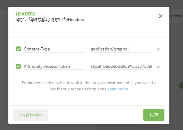 9、设置 Headers ,Content-Type: application/graphql,X-Shopify-Access-Token: {access_token}。如图8