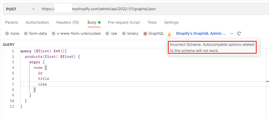 8、启用 GraphQL 查询自动完成。从下拉列表中选择您的架构:Shopify’s GraphQL Admin API。Postman 现在将根据新 GraphQL 模式中的数据建议自动完成选项。但是提示错误:incorrert schema. Autocomplete options related to the schema will not work.。如图6