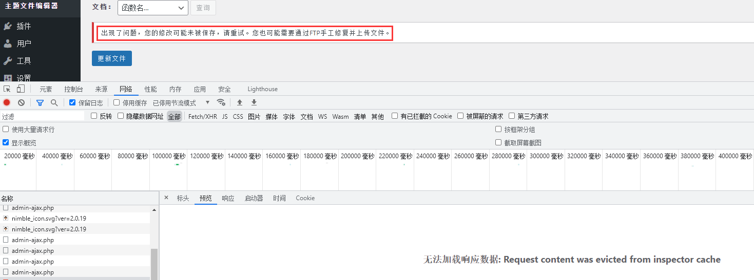 6、当添加了大于 50 MB 的内容时,响应 502。出现了问题,您的修改可能未被保存,请重试。您也可能需要通过FTP手工修复并上传文件。查看网络中的响应:无法加载响应数据: Request content was evicted from inspector cache。确认新添加的内容已经成功保存至模板文件中。通过重新查看模板文件内容确认。如图6