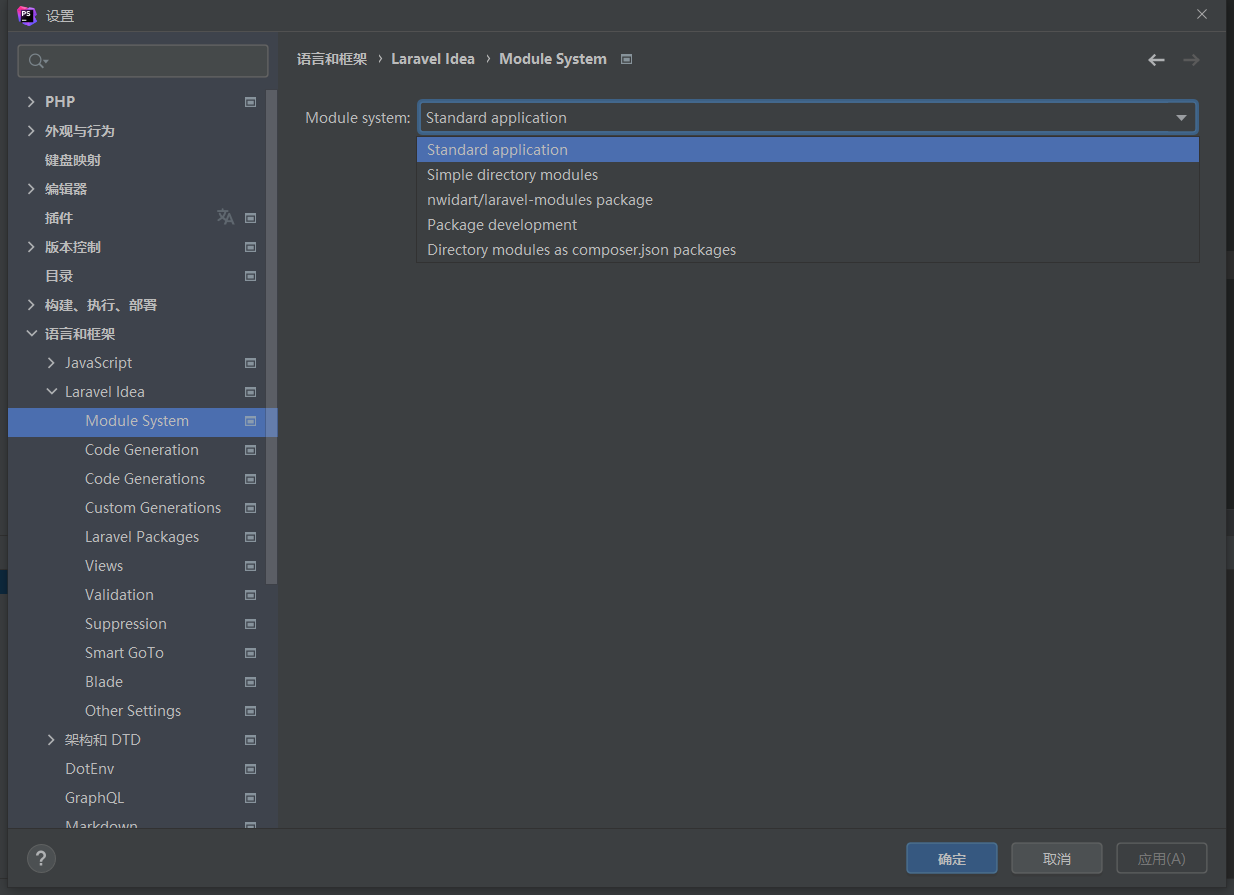 2、参考:https://laravel-idea.com/docs/modules 。Laravel Idea 使用模块系统概念来理解应用程序的结构。 它有助于正确完成视图、配置、路由和更方便的代码生成。项目的模块系统可以在 File | 设置 | 语言和框架 | Laravel 理念 | 模块系统 找到。如图2
